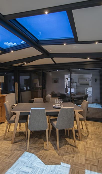 Lire la suiteTrès esthétique, la toiture vitrée offre une clarté exceptionnelle à votre véranda, favorisant l’entrée de lumière et les apports solaires. Vous pouvez opter pour une toiture entièrement vitrée afin de profiter d’une vue totalement dégagée sur le ciel. Pensez toutefois à prévoir une protection solaire pour limiter la chaleur et l’éblouissement, et ainsi continuer à profiter pleinement de votre véranda même en été ! Choisissez un vitrage avec isolation renforcée ou contrôle solaire, ou ajoutez un système d’occultation comme un volet roulant ou coulissant. Une autre solution : le vitrage SageGlass®, qui combine tous les avantages en offrant lumière naturelle et contrôle solaire grâce à sa variation de teinte.